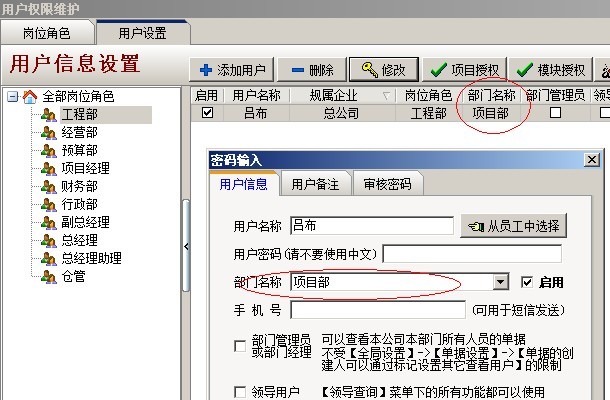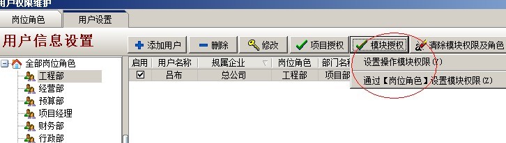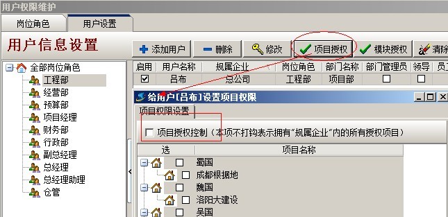 C:項(xiàng)目授權(quán)判斷,是指判斷該用戶是否有項(xiàng)目授權(quán),在系統(tǒng)維護(hù)模塊中【用戶管理權(quán)限設(shè)置】和項(xiàng)目維護(hù)中都可以進(jìn)行設(shè)置用戶項(xiàng)目授權(quán)。設(shè)置方法如下圖: