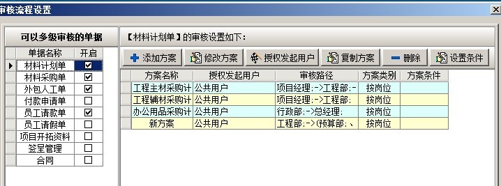 6. 業(yè)務(wù)單據(jù)是多級審核,審核流程中的待審核用戶不受限制。審核流程設(shè)置是在系統(tǒng)維護(hù)模塊,【審核流程設(shè)置】中進(jìn)行設(shè)置。如下圖:左側(cè)是單據(jù)名稱列表,右側(cè)是單據(jù)審核的各種方案。