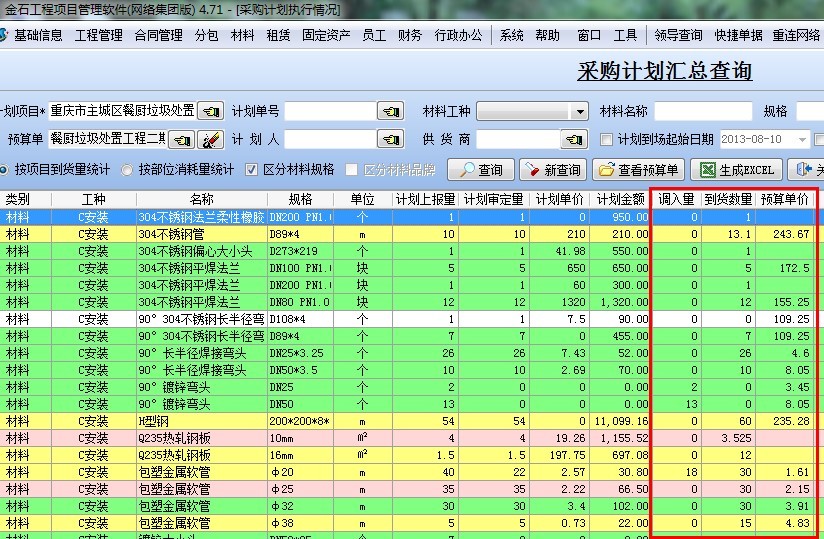 分析:公司給項目代購和調撥的主材費通過【材料管理】-【采購計劃執行匯總】來核對得出,(調入量+到貨量)*預算單價。如下圖: