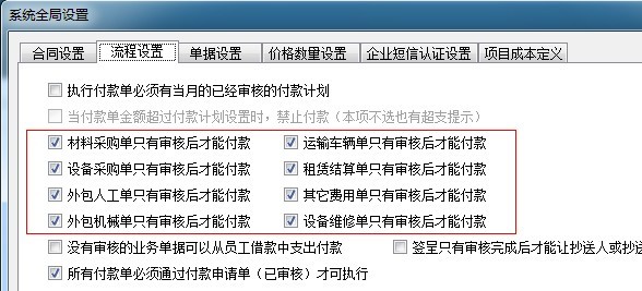 公司規定:只有審核后的單據才能提起付款申請,所以超級用戶已經在【全局設置】中開啟了以下八個開關: