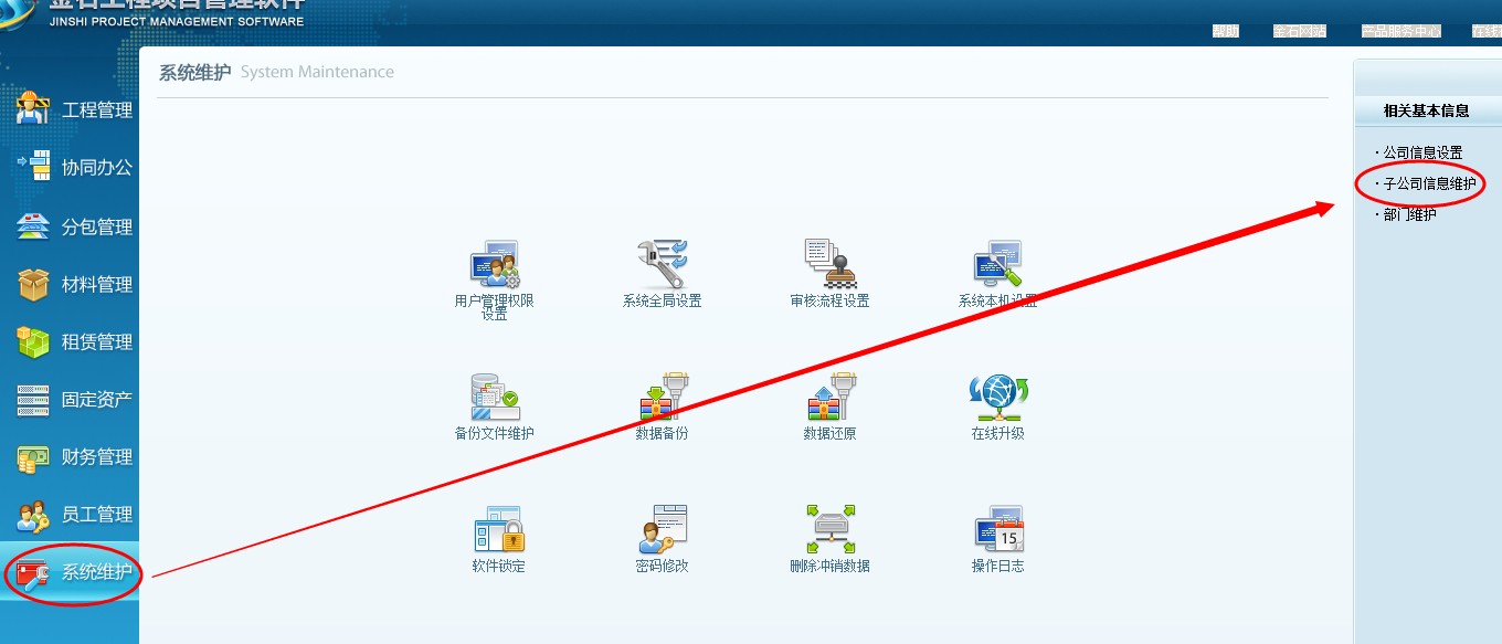 一、 項目按分公司授權 (注:適用于有分公司的的企業使用)1、首先登錄超級用戶,導航欄---系統維護---子公司信息維護中設置幾個子公司名稱。