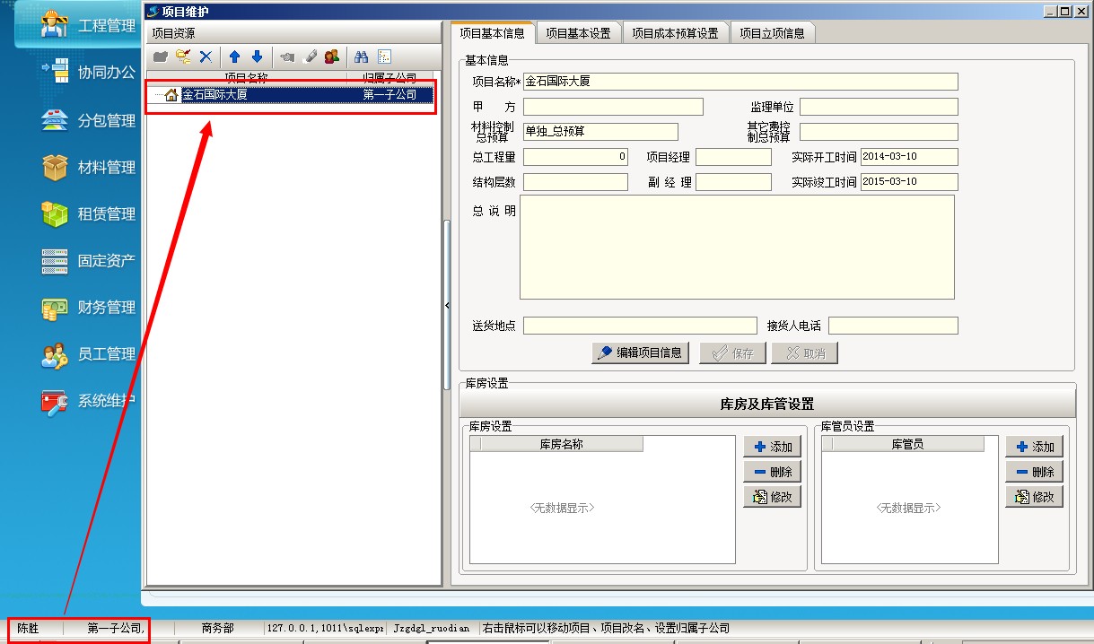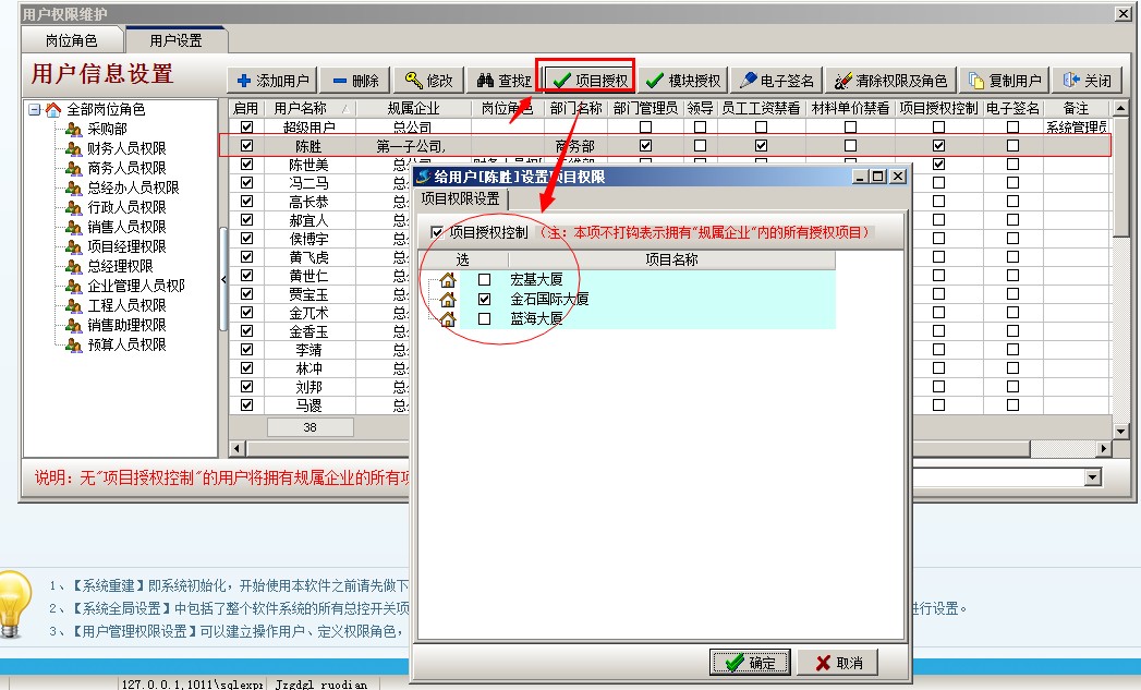 二、 項目按個人授權 (注:適合普通企業 或 集團公司下的分公司) 1、 以剛才陳勝為例,只讓他看到金石國際大廈 項目 (配合上面的項目按分公司授權,這樣就可以實現集團公司的項目二級授權)具體操作:登錄超級用戶---系統維護---打開用戶管理權限設置,選擇員工陳勝,點項目授權,開啟項目授權控制,在金石國際大廈這個項目前面打鉤