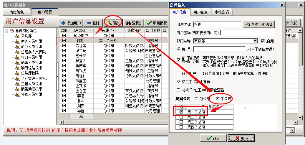 將陳勝設置為一分公司登錄超級用戶,導航欄---系統維護---用戶管理權限設置,打開權限維護窗口,選中陳勝,點修改,在彈出的密碼修改窗口,選擇歸屬公司為子公司,子公司名稱為第一子公司