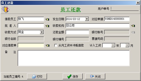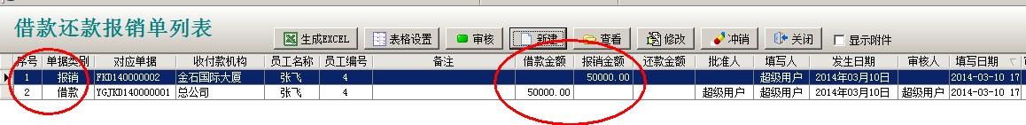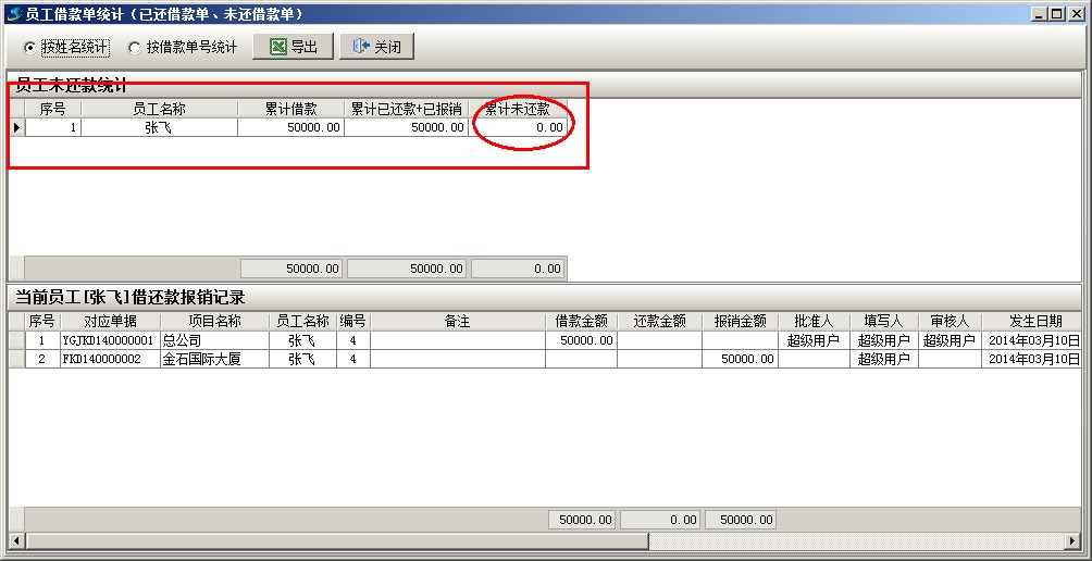 借還款單列表中2個單據(jù),一個是業(yè)務(wù)員(張飛)的借款,另一個報銷還款單據(jù),兩個單據(jù)抵消,業(yè)務(wù)員(張飛)就沒有欠款。還可以通過員工借款單統(tǒng)計查詢,財務(wù)管理模塊------相關(guān)查詢-----員工借款單統(tǒng)計。