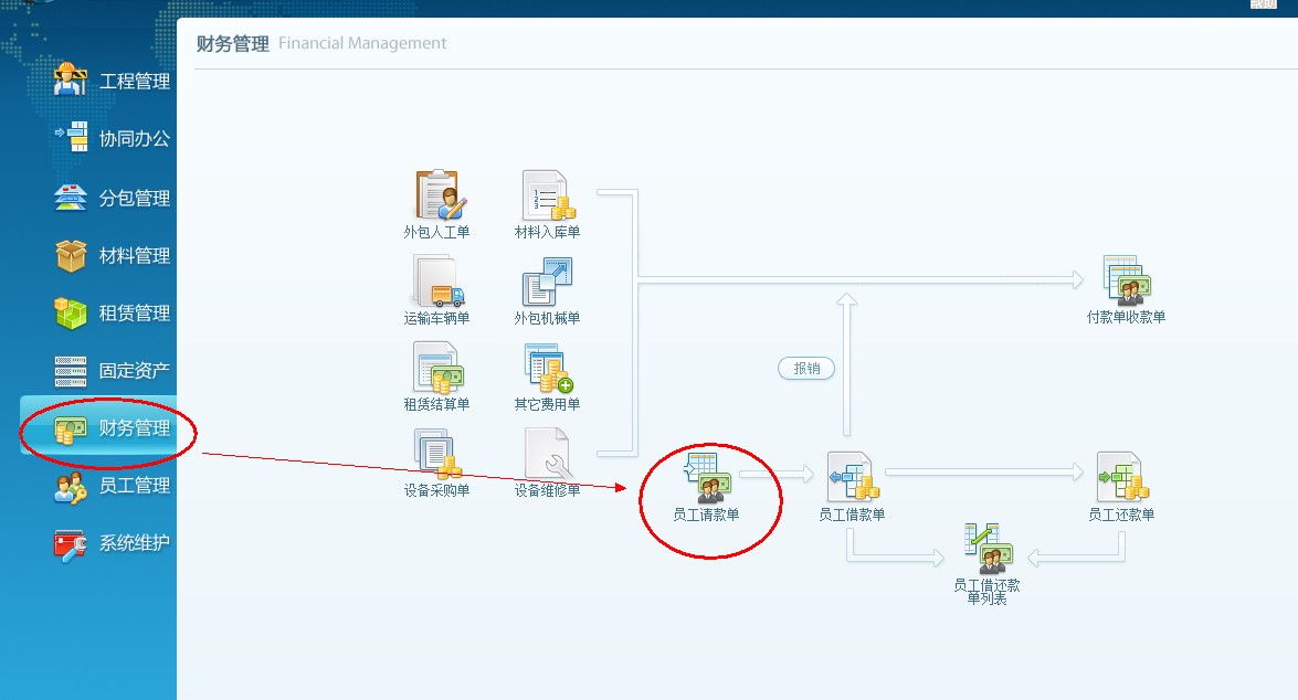 4、下面查詢一下業(yè)務(wù)員借款,點(diǎn)擊財務(wù)管理,打開員工借還款單列表