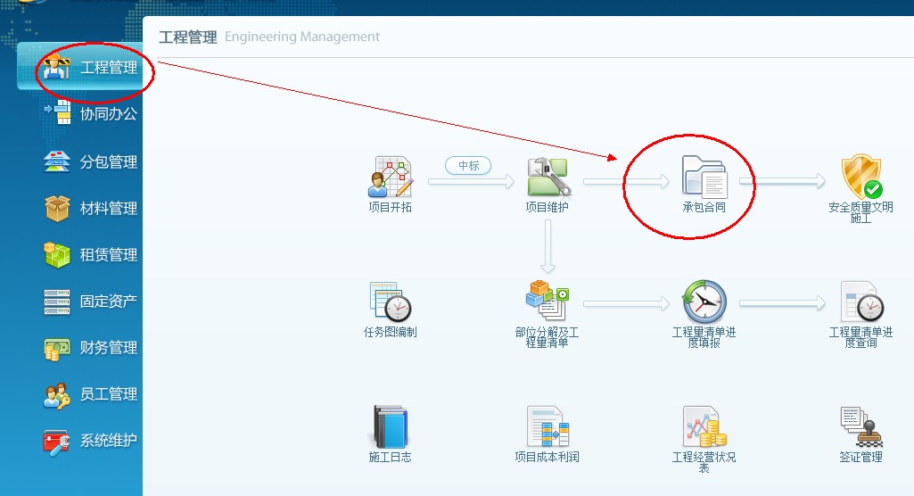 3、如果是項目中標(biāo), 項目新建之后,接著建立承包合同,打開工程管理,點(diǎn)擊承包合同
