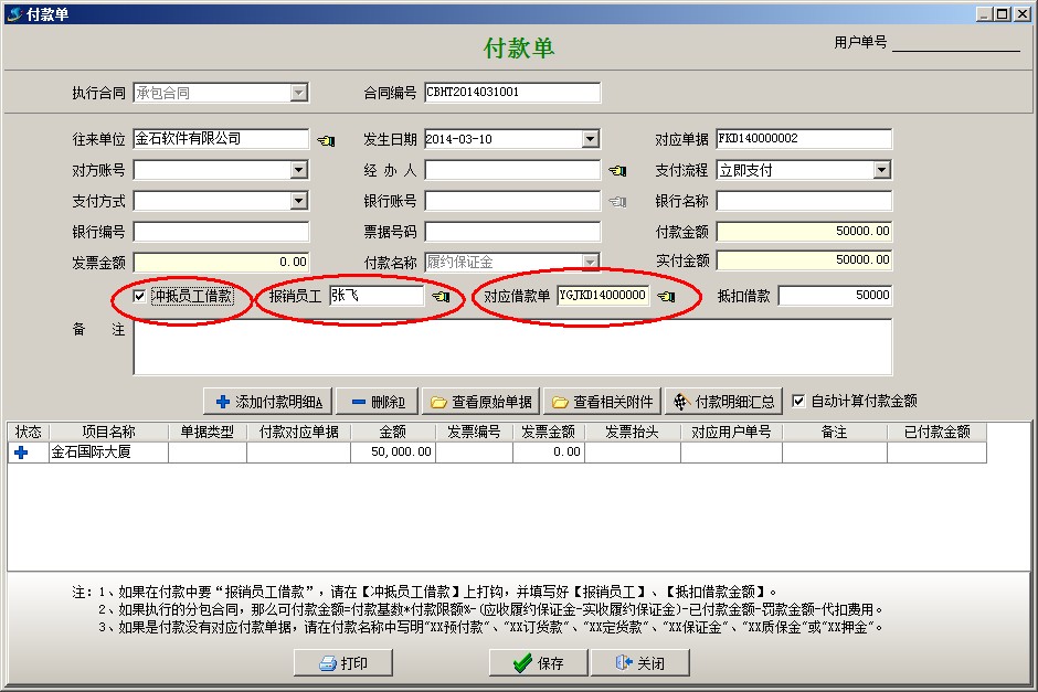 (3)最后做付款單沖抵員工借款,把當(dāng)時交納的保證金報銷出來。