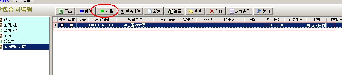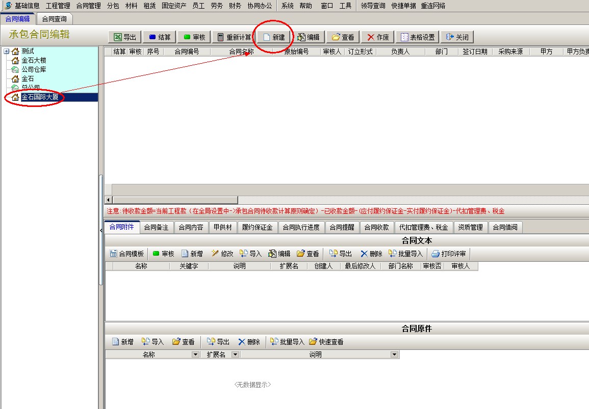 左邊選中新建的項目名稱金石國際大廈,右邊點(diǎn)擊新建,彈出新建承包合同窗口,錄入合同基本信息,填寫合同履約保證金金額,然后保存。